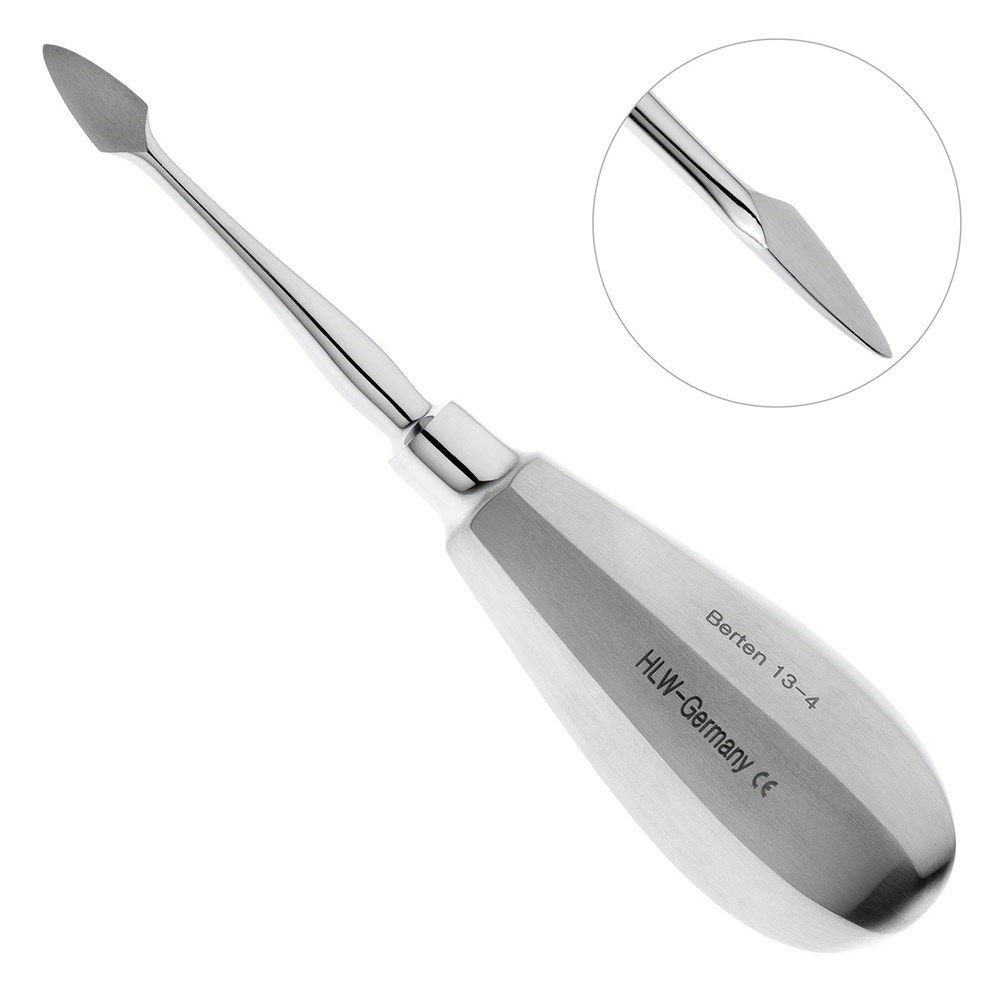 Элеватор конструкции Бертена производства немецкой компании HLW Dental Instruments используется для удаления корней и зубов на верхней и нижней челюсти.