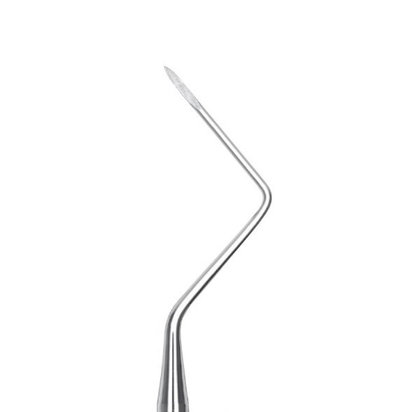 Тонкий длинный изогнутый в двух точках рабочий стержень легко проникает в пространство между стенкой альвеолы и корнем. Полукруглое лезвие на самом кончике иссекает периодонтальную связку.