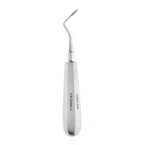 Элеватор изогнутый конструкции ХЕЙДБРИНКА от себя. Рабочая часть имеет двойной разнонаправленный изгиб по ребру, заостренный край в виде когтя. Ширина рабочей части не более 2,5 мм. Полая восьмигранная ручка плавно переходит в функциональный стержень инструмента. Мартенситная сталь DIN 1.4006, X10Cr13 (ГОСТ 12X13). Твердость по Роквеллу 40-45 RW.