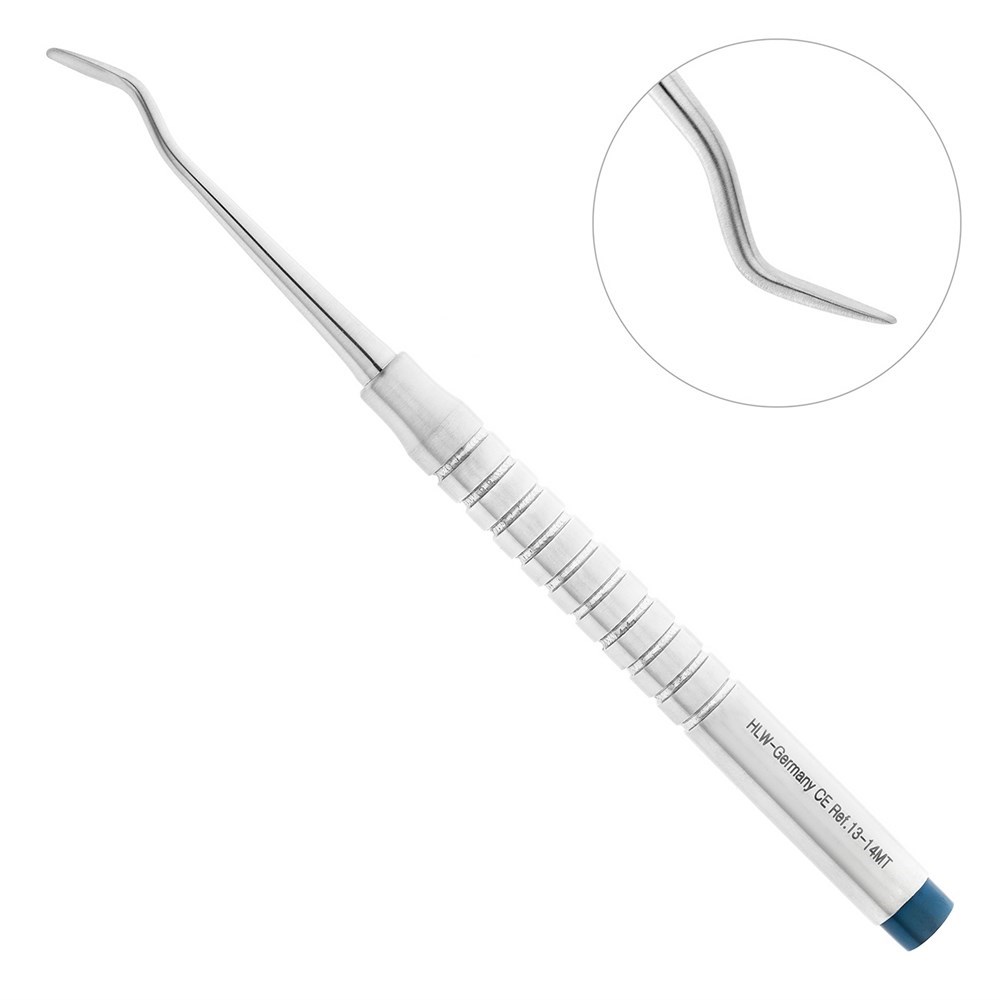 Для атравматичного удаления корней и зубов на нижней челюсти используется изогнутый мини элеватор производства немецкой компании HLW Dental Instruments.