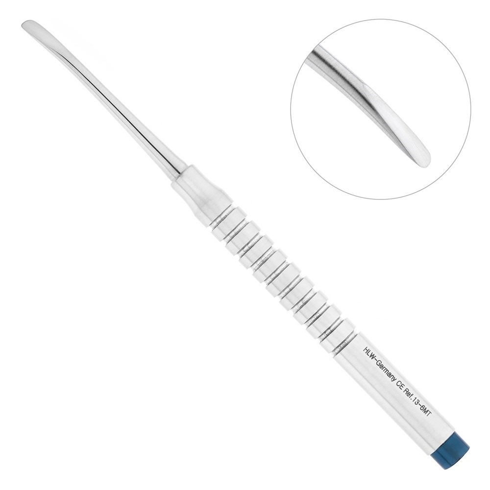 Для атравматичного удаления корней и зубов на нижней челюсти применяется изогнутый мини элеватор производства немецкой компании HLW Dental Instruments.
