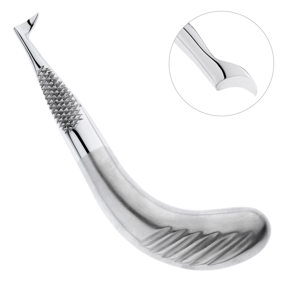 Полая изогнутая ручка элеватора имеет утолщение в месте захвата и ретенционные насечки на внешней поверхности инструмента. Такая конструкция рукоятки препятствует скольжению элеватора в руке и способствует эффективному проведению операции.