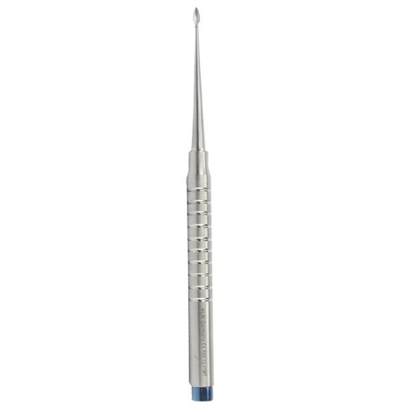 Элеватор изогнутый по плоскости. Рабочая часть прямая, имеет штыковидную треугольную форму и выемку в форме жёлоба. Ширина рабочей части не более 3,0 мм. Цельнометаллическая ручка в форме вытянутого цилиндра и с поперечными бороздками плавно переходит в функциональный стержень инструмента.