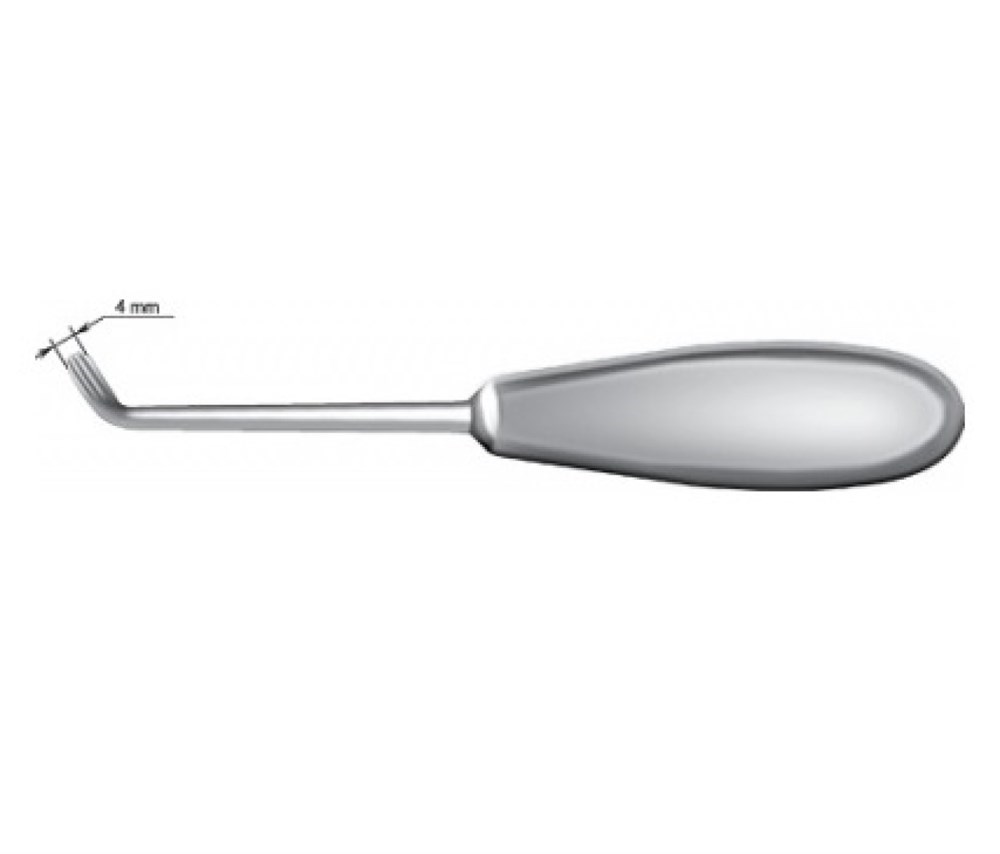 Элеватор правый, экстракционный, производства Белорусь (Струм). Снабжен скруглённой эргономичной ручкой, к которой при помощи суженного соединительного стержня крепится щёчка шириной 4 мм, выпуклая с одной и вогнутая - с другой стороны. Лезвие с желобком ориентировано вправо относительно оси ручки.