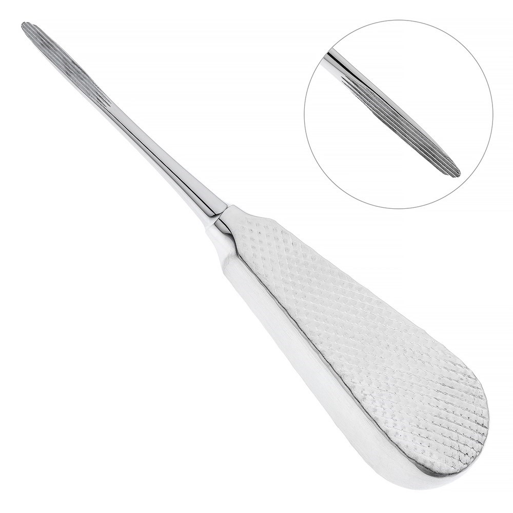 Снаружи ручка элеватора покрыта ретенционным узором, предотвращающим скольжение фаланг пальцев в перчатке. Плоская форма ручки удобна в использовании и способствует проведению операции.