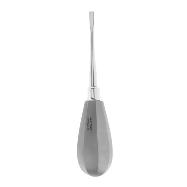 Рабочая часть и рукоятка инструмента находятся на одной прямой. Такая конструкция элеватора удобна при работе во фронтальной группе зубов. Прямое окончание рабочей части инструмента без затруднений вводится в предварительно распиленные стенки коронки и обеспечивает атравматичное отгибание их в противоположные стороны. Такой метод снятия коронки позволяет избежать повреждения коронковой части зуба.