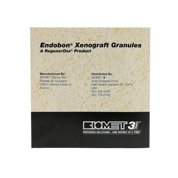 Endobon Xenograft — ксеноматериал в гранулах (бычий гидроксиапатит). Основа для образования кости Endobon Xenograft Granules, является резорбируемым материалом животного происхождения, полностью соответствует высоким стандартам качества, предназначен для пародонтологии и челюстно-лицевой хирургии.