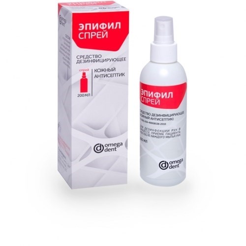 Описание: Эпифил спрей-спиртовой кожный антисептик 200мл, Омега-Дент  Показания к применению Средство "ЭПИФИЛ СПРЕЙ" предназначено для профессионального применения в учреждениях стоматологического профиля, а также в прочих организациях, имеющих право заниматься дезинфекционной деятельностью. Дезинфицирующее средство – кожный антисептик "ЭПИФИЛ СПРЕЙ" представляет собой готовое к применению средство в виде прозрачной жидкости светло-голубого оттенка с мятным запахом.   Состав В качестве действующих веществ содержит: изопропиловый спирт; хлоргексидина биглюконат, а также увлажняющие, смягчающие и тонизирующие добавки, ароматизатор идентичный натуральному «Мята», прочие технологические и функциональные компоненты.   Способ применения: Нанести 'Эпифил спрей' с помощью распылителя на руки и растереть до полного испарения жидкости.   Упаковка: Флакон с жидкостью 200 мл.