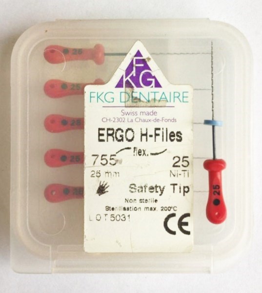 Ручные эндодонтические файлы изготовлены из стали или NiTi стандартных ISO размеров от 6 до 40, имеют неактивный безопасный кончик, который является эксклюзивной разработкой компании FKG, и эргономичную ручку – (SMG). Эргономичную ручку удобнее держать, благодаря увеличенному диаметру. На конце ручки расположен 8-сегментный индикатор кратности использования. После каждого применения на один сегмент наносится засечка, то есть фиксируется информация о количестве циклов использования и стерилизации. Когда все сегменты помечены засечками, инструмент необходимо утилизировать.