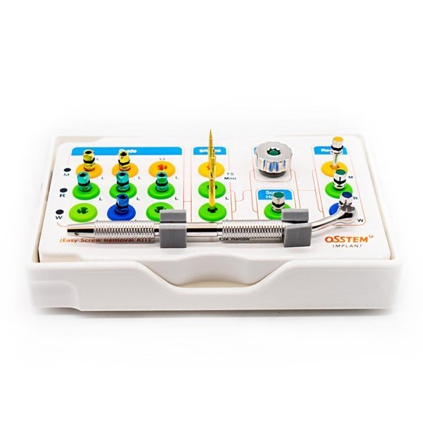 Абатмент и винт абатмента – две наиболее распространенные части имплантата, где может случиться поломка. ESR KIT, набор для удаления винта - простой в использовании набор инструментов, разработанный специально чтобы помочь стоматологам быстро и эффективно справляться с проблемой удаления сломанного винта или абатмента. Процент успешных операций с помощью набора составляет 90%.
