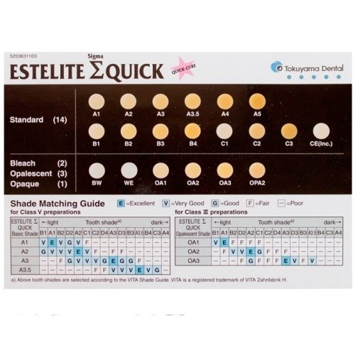 При работе с материалом следует учитывать его высокую прозрачность. При проведении реставраций для восстановления шейки и тела зуба используют основные оттенки (OA1 OA2 OA3 BW), Эмалевые оттенки применяют для выделения зон прозрачности (режущий край, вершины бугров и эмалевых гребней). Опаковые оттенки Estelite Sigma Quick более прозрачные чем у других производителей. В качестве маскировочного агента и для придания дополнительной опаковости при сквозных реставрациях рекомендуется применять универсальный опак (оттенок OPA2).