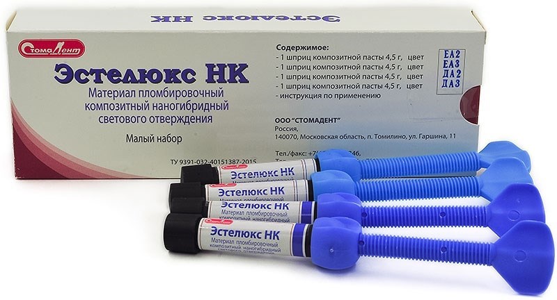 НАЗНАЧЕНИЕ. Композитный пломбировочный наногибридный материал светового отверждения "Эстелюкс НК" предназначен для высокоэстетичной реставрации зубов I - VI классов у взрослых и детей, сэндвич-техники, изготовления вкладок, накладок и виниров, восстановления культи зуба.