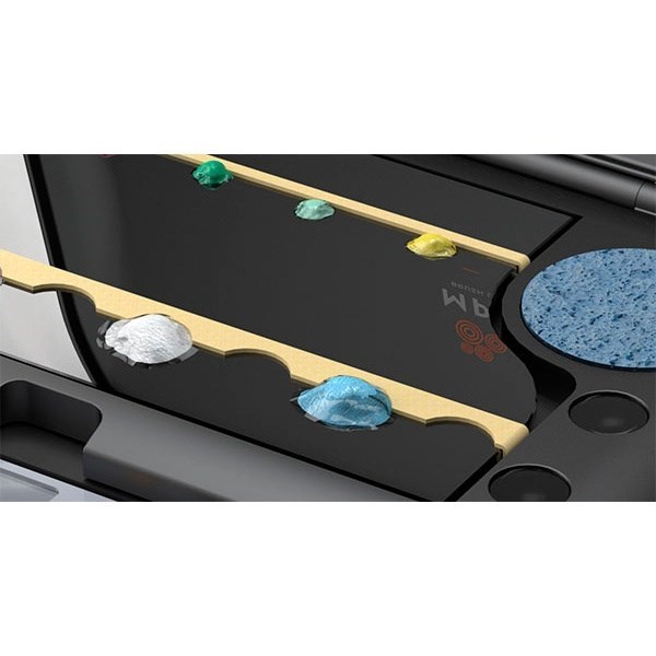 - Эргономичный дизайн включает в себя губку для очистки кисти, выдвижной модуль с палитрой для красок и уникальные полоски из синтетической кожи и целлюлозы, для транспортировки влаги из резервуара к Вашей керамической массе