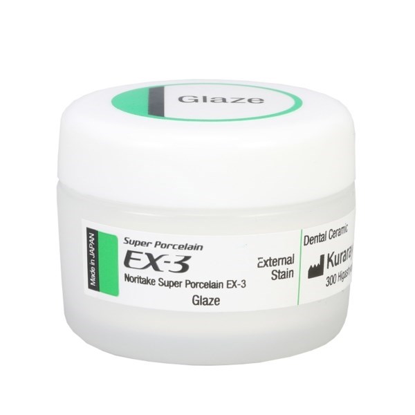EX-3 Glaze глазурь создает полную имитацию естественного цвета и гладкую поверхность. Обладая минимальной термоусадкой, глазурь обеспечивает точное прилегание краев зубного протеза. Имеет стойкость к позеленению, вызванному материалами, содержащими серебро.