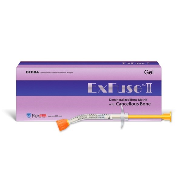 - ExFuse гель/мастика содержит комбинацию деминерализированного костного матрикса (ДКМ) и носителя (карбоксиметил-целлюлоза)