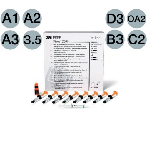 Универсальный наногибридный реставрационный материал Filtek™ Z550 является светоотверждаемым наногибридным композитным материалом, предназначенным для восстановления передней и боковой групп зубов. Материал используется совместно со стоматологическим адгезивом. Данный композитный материал выпускается в 12 оттенках, два из которых являются опаковыми. Все оттенки рентгеноконтрастные и флуоресцентные. Материал выпускается в шприцах.