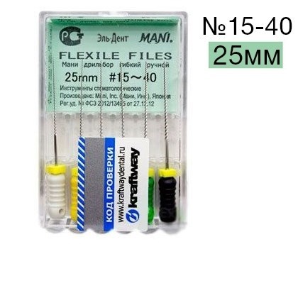 Описание: Flexile Files Мани №15-40 - (25 мм) упаковка 6 шт.Flexile Files - Ручной режущий стоматологический эндодонтический инструмент со спиральной нарезкой рабочей части. Материал рабочей режущей части - нержавеющая сталь, материал рукоятки – пластик (полибутилентерефталат).