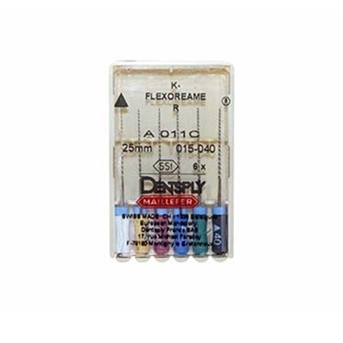 Flexoreamer набор каналорасширителей ручных. Изготовлены из нержавеющей стали треугольного поперечного сечения с укороченным шагом. Инструмент имеет эргономическую пластмассовую ручку. Длина оперативной части 21 мм. Начальный диаметр рабочей части инструментов входящих в набор цветовая маркировка: 0,15 мм белая - 1 шт., 0,20 мм желтая -1 шт., 0,25 мм красная - 1 шт., 0,30 мм синяя - 1 шт., 0,35 мм зеленая - 1 шт., 0,40 мм черная - 1 шт. , Силиконовый стоп толщиной 1,5 мм. Упаковка 6 шт.