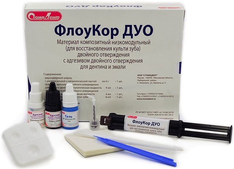 НАЗНАЧЕНИЕ. Композитный текучий (низкомодульный) материал двойного отверждения «ФлоуКор ДУО» используется в терапевтической и ортопедической стоматологии для восстановления культи зуба. Применяется как для формирования культи зуба, так и для фиксации стекловолоконных и анкерных штифтов в корневом канале