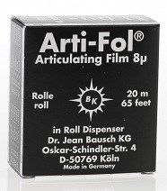 Окклюзионная фольга Бауша Arti-Fol особенно хорошо годится для многоцветной регистрации статической и динамической окклюзии. На первом этапе окрашиваются в красный цвет контакты в положении центральной окклюзии. Затем используется чёрная фольга, с помощью которой регистрируются динамические контакты при эксцентрических движениях нижней челюсти.