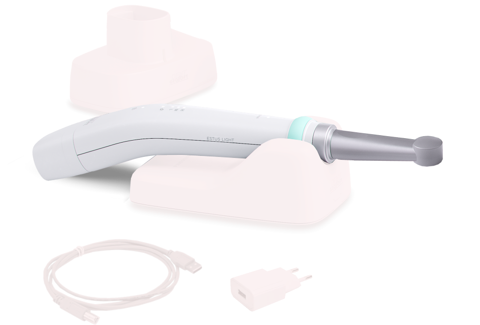 - трансиллюминация — диагностика начальных кариозных изменений, скрытых кариозных полостей или дефектов, трещин эмали, контроля качества реставрации и адаптации композитных материалов к твердым тканям зуба с помощью источника света, излучающего в спектре оранжевого света в диапазоне 585-595 нм. Функция реализуется при использовании диагностической насадки «ESTUS LED - ORANGE».
