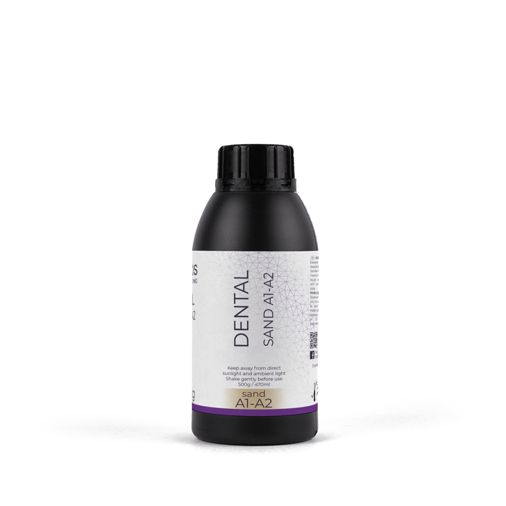 Фотополимер не имеет запаха, после дозасветки имеет цвет А1-А2 по шкале Вита. Фотополимер Dental Sand A1-A2 представляет собой композитную смолу с керамическим микро-наполнением типа PMMA, изготовленную из биосовместимого сырья, цвет которой находится в диапазоне A1-A2 по шкале Vita. Он обладает высокой твердостью 90 по Шору D и высокой прочностью на растяжение, устойчив к механическим и химическим воздействиям. Рекомендуется для печати временных коронок и мостов. Слабый запах и отсутствие вредных мономеров позволяет печатать в лаборатории.
