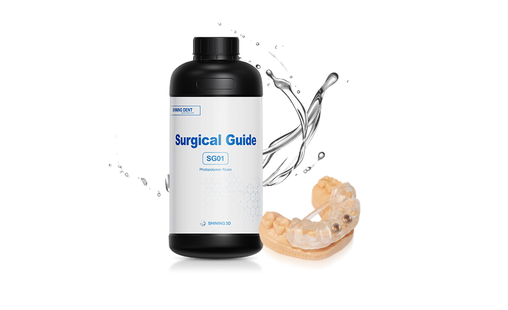 Accufab-01 Surgical guide (SG01) является биосовместимым материалом, разработанным для печати хирургических шаблонов (направляющих для более точного сверления и быстрого проведения операции). Высокая точность материала - постоянство сохранения точных размеров и прозрачность - позволяет прецизионно позиционировать сверло и другие хирургические инструменты при работе стоматолога.