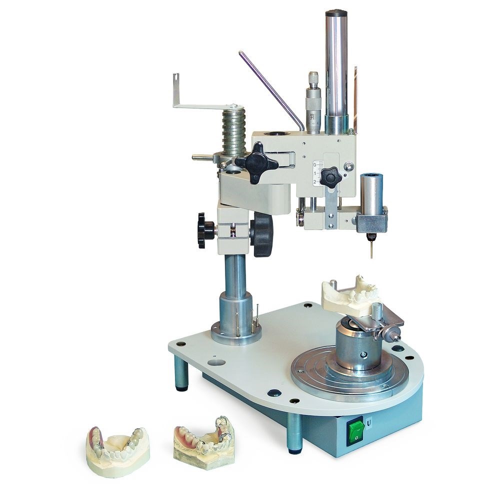 Универсальный фрезерно-параллелометрический станок с возможностями фрезерования и сверления: электромагнитная фиксация столика для моделей, универсальная головка для наконечников и инструментов диаметром22...30 мм, микрометр высокоточного сверления, ручной привод плавного вертикального перемещения двухшарнирного манипулятора. В комплекте: столик для фиксации моделей УС 1.2, набор измерительных стержней АНАЛИТИК 1.0, грифеледержатель ГРИФЕЛЬ 1.0.