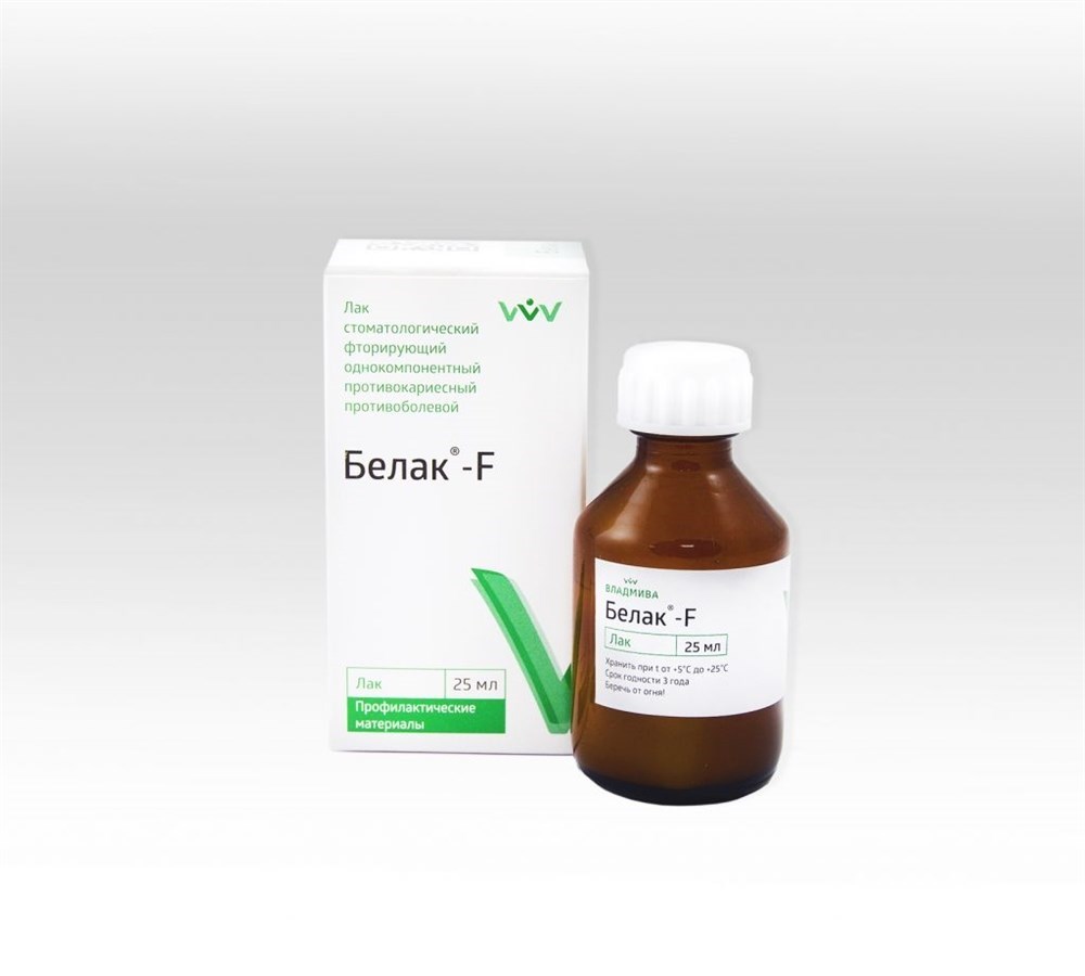 «Белак-F» белый. В его состав входят растворитель, пленкообразователь, калий фтористый. Ионы фтора, содержащиеся в препарате, укрепляют эмаль зубов, снижают ее проницаемость, предохраняют зубы от развития кариеса.