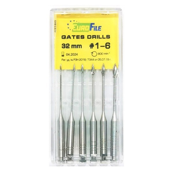 Gates Drills - дрильборы машинные, для расширения коронковой трети канала, 32 мм, размер 1-6, сталь, 6 шт
