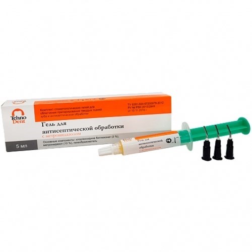 Антисептический ГЕЛЬ содержит: хлоргексидина биглюконат (2 %) и метронидазол (10 %) – антисептики, активно подавляющий анаэробную флору корневых каналов зубов. Благодаря гидрофильной основе гель легко вводится в каналы, глубоко проникает в дентинные канальцы и легко вымывается водой из корневых каналов.