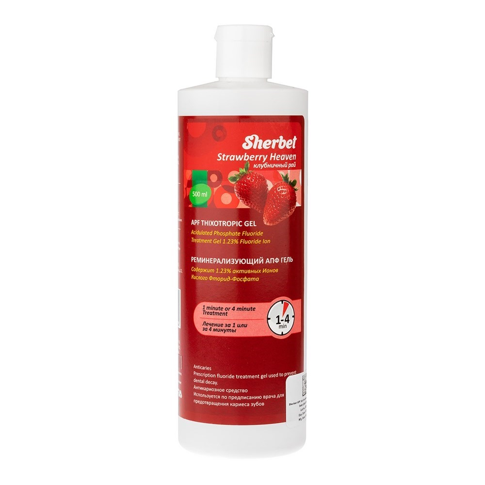 Гель Sherbet APF с клубничным вкусом обычно используется на стоматологическом приеме для предотвращения заболевания кариесом и для снижения чувствительности зубов на температурные (холод, тепло) и химические раздражители (кислое, сладкое). Содержание ионов фторида - 1.23% с показателем pH 3.0.