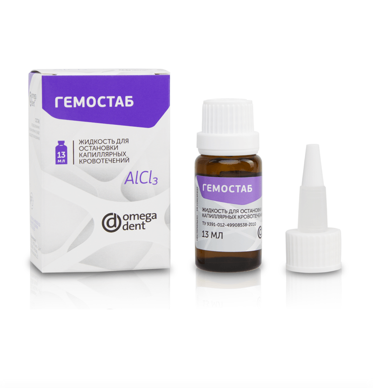 Благодаря входящему в состав хлориду алюминия, "ГЕМОСТАБ" позволяет остановить капиллярное кровотечение. Для этого необходимо изолировать участок с помощью ватного тампона и обработать поверхность десны кровоостанавливающим раствором.