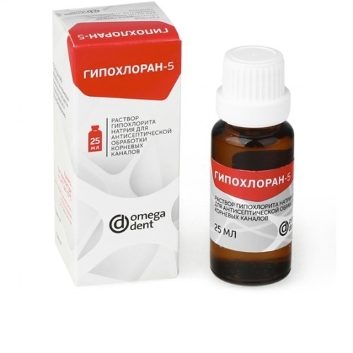 Описание: Гипохлоран 5 Nа 5% 25 мл ОмегаГипохлоран-5 - раствор гипохлорита натрия для антисептической обработки корневых каналов.