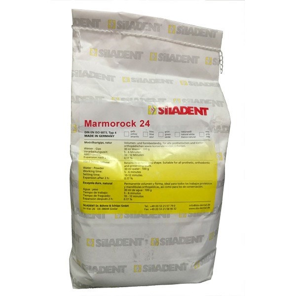 Siladent Marmorock 24 (Марморок 24) гипс стоматологический, цвет золотой коричневый, натуральный стоматологический гипс, который обладает отличной текучей консистенцией и обеспечивает исключительную прочность. Модели характеризуются предельной прочностью краев и прочностью на сжатие. Marmorock очень устойчив к царапинам и деформации и в то же время имеет очень низкий коэффициент расширения.