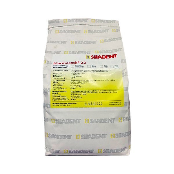 Marmorock 22. Натуральный гипс Обладает отличной текучей консистенцией и обеспечивает исключительную прочность. Модели характеризуются предельной прочностью краев и прочностью на сжатие. Очень устойчив к царапинам и деформация и в то же время имеет очень низкий коэффициент расширения. При работах требующих особой быстроты, рекомендуется использовать быстротвердеющую модификацию Marmorock Speed, время кристаллизации которого, составляет всего 6-7 минут. Область применения: отливка рабочих моделей под мосты, коронки, также моделей применяемых при протезировании на имплантантах, мастер моделей при работе с драгоценными и недрагоценными металлами, контрольных и антагонистических моделей.