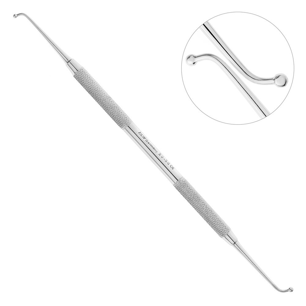 Двусторонний инструмент представляет собой держатель в виде стержня, на обоих концах которого расположены рабочие части шаровидной формы. Диаметр одного конца рабочей части 2 мм, другого- 2,5 мм. Такое строение инструмента прекрасно подходит для пломбирования жевательных зубов при помощи конденсируемых композитов. Также разные рабочие части можно использовать в зависимости от размера кариозной полости.