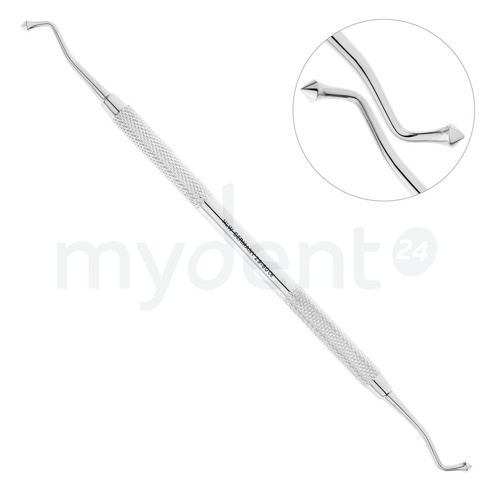 Двусторонний штопфер представляет собой держатель в виде стержня, на обоих концах которого расположены симметричные рабочие части, каждая из которых имеет ромбовидную форму. Благодаря такой конструкции инструмент идеально подходит для моделирования окклюзионной поверхности зуба пломбировочным материалом из амальгамы.