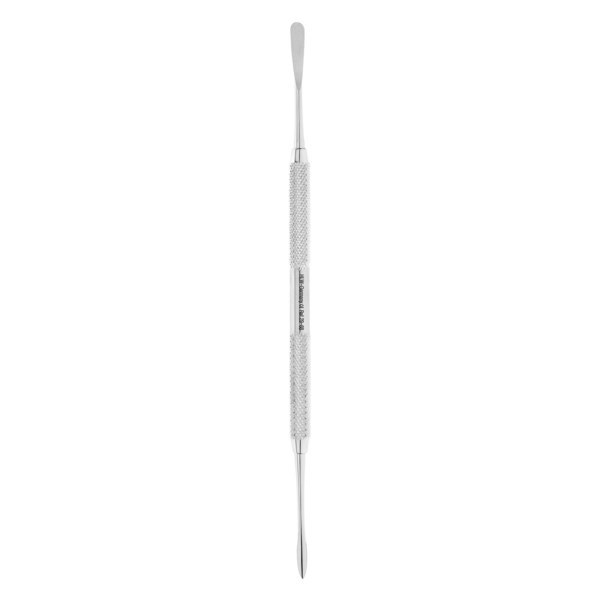 Другой функциональный стержнень оканчивается плоской ложкой. Ручка круглая диаметром не более 6 мм и покрыта ретенционным узором предотвращающим скольжение инструмента в фалангах пальцев врача при работе.