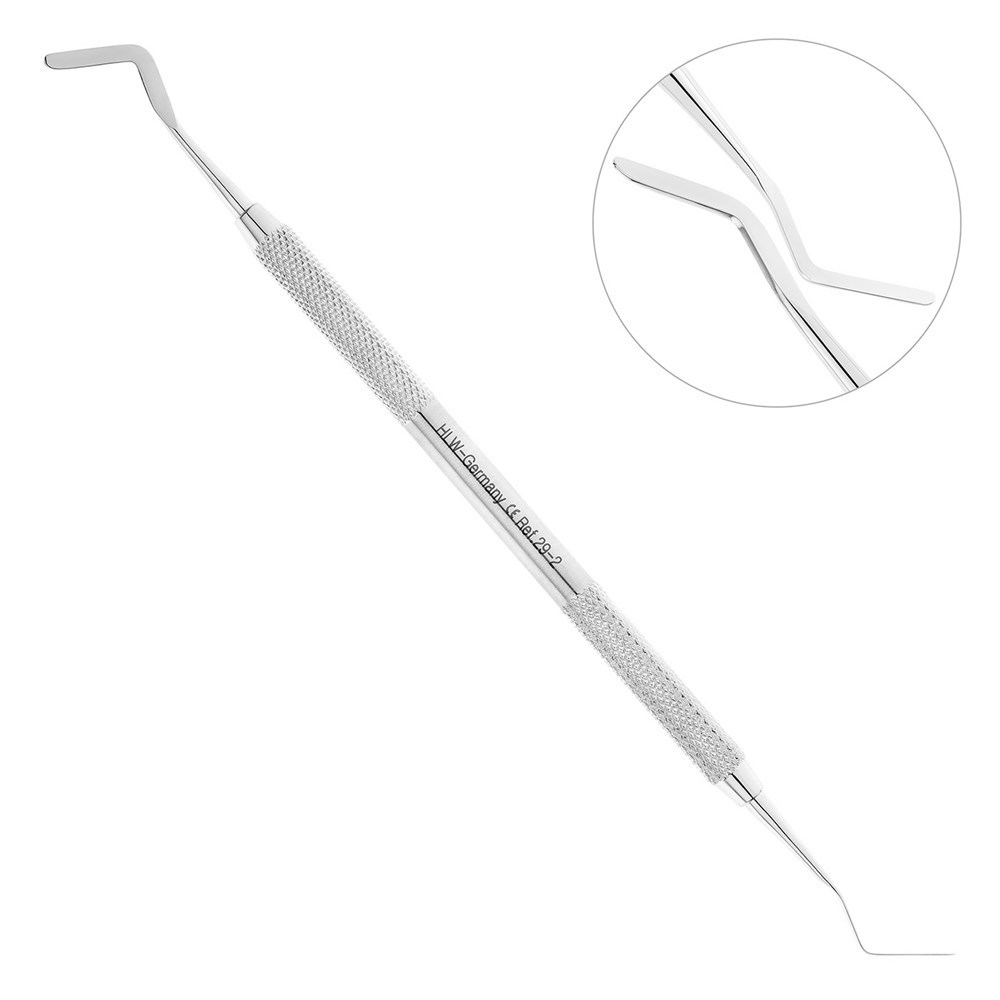 Обе рабочие части инструмента имеют двойные байонетные изгибы по ребру, что обеспечивает ввод инструмента в глубокие и труднодоступные участки полости рта.