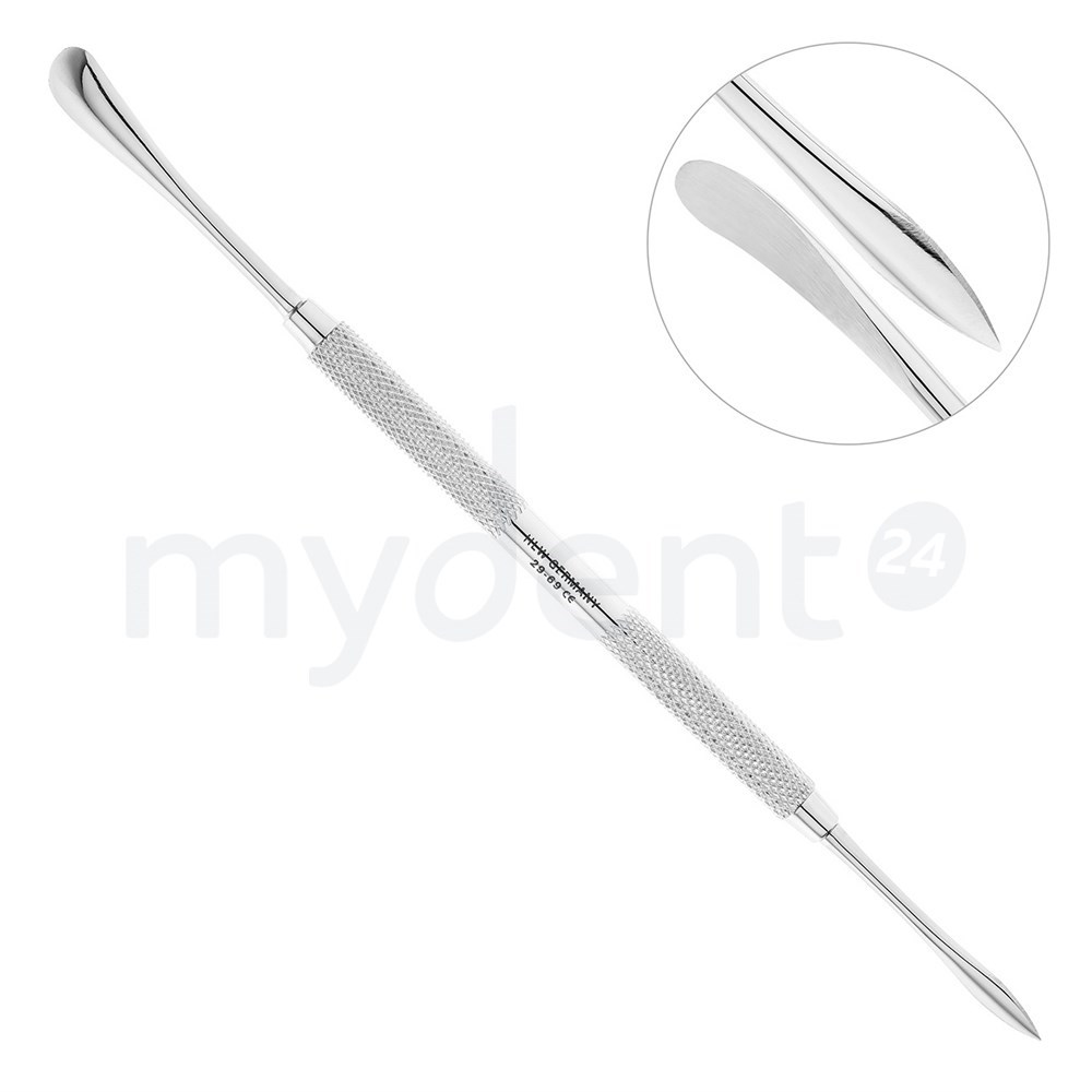 Двусторонний инструмент представляет собой держатель в виде стержня, на обоих концах которого расположены асимметричные рабочие части. С одной стороны распатор имеет закругленную рабочую часть, с другой - каплевидную с заостренным окончанием. Благодаря такой конструкции инструмент идеально подходит для различных видов оперативного вмешательства.