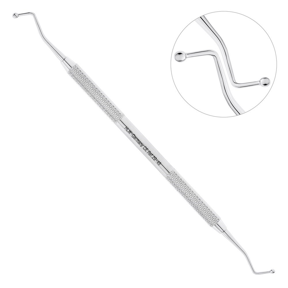 Цилиндрическая ручка стоматологического инструмента удобна в использовании и предотвращает скольжение фаланг пальцев в перчатке, благодаря ретенционным узорам на поверхности рукоятки.