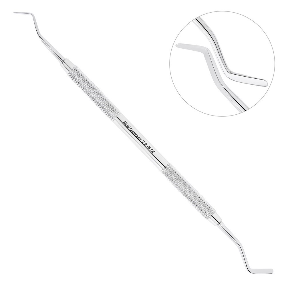 Оба функциональных стержня жесткой гладилки имеют двойной изгиб по ребру, благодаря чему инструмент используется при пломбировании полостей, расположенных в апроксимальных зонах.