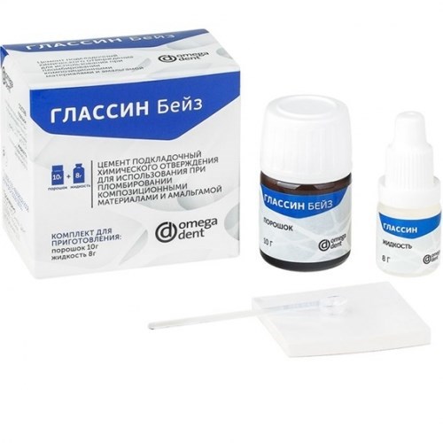 Описание: Глассин Бейз-подкладочный цемент, ОмегаГЛАССИН Бейз – это стеклополиалкенатный (стеклоиономерный) рентгенконтрастный подкладочный цемент, применяющийся в стоматологической практике в качестве изолирующей подкладки при пломбировании зубов композитами и амальгамой. При наличии глубокого кариеса используется с материалом на основе гидроокиси кальция. Порошок представлен в виде мелкодисперсного алюминий-кальций латан фторкремниевого стекла с рентгеноконтрастными добавками. Жидкая часть препарата является водным раствором полиакриловой кислоты определенной молекулярной массы с улучшающими ее свойства органическими присадками. Благодаря системе «жидкость + порошок» все дисперсные частицы образованной структуры имеют прочные связи, что предотвращает их вымывание из цемента. ГЛАССИН Бейз обладает химической адгезией к эмали и дентину и характеризуется высокой биологической совместимостью с твердыми тканями зуба, а за счет пролонгированного высвобождения ионов фтора обеспечивает максимальный противокариесный эффект.   Противопоказания Повышенная чувствительность к одному из компонентов материала. Не использовать не по назначению.   Состав Порошок: алюминий-кальций-лантан-фторкремниевое стекло с содержанием ионов Ca; Al; La; F; P; Si Жидкость: полиакриловая кислота органические добавки   Комплектация Порошок (стеклянная баночка) 10 г – 1 шт. Жидкость (флакон-капельница) 8 г – 1 шт. Блок для смешивания – 1 шт. Ложка-мерник – 1 шт. Инструкция по применению – 1 шт.   Способ применения Провести механическую обработку по общепринятой методике, промыть и высушить полость, но не пересушивать. Флакон с порошком встряхнуть перед применением. Готовят материал при комнатной температуре на стеклянной пластине или специальном блокноте шпателем. Цемент можно применять в двух консистенциях: жидкой и густой. Жидкая – для изолирующих (лайнерных) подкладок: 1 ложечка порошка с 1 каплей жидкости. Густая – для базовых подкладок: 2 ложечки порошка с 1 каплей жидкости. Предлагаемые соотношения порошка и жидкости приблизительные, и в каждом конкретном случае пропорцию следует определять самостоятельно для получения пасты необходимой консистенции. Сначала с полной порцией жидкости смешивают половину порции порошка. Оставшуюся часть порошка вводят маленькими порциями до получения однородной смеси с глянцевой поверхностью. Смешивание производят в течение 60 сек. до получения пасты необходимой консистенции. Рабочее время приготовленного материала от 1,5 до 2 мин. Материал вносят в подготовленную полость при помощи штопфера или гладилки и равномерно распределяют, покрывая всю дентинную область. Время твердения материала 5 мин. с момента начала смешивания. По истечении этого времени можно приступить к дальнейшим манипуляциям, связанными с пломбированием композитными или иными материалами. Только для профессионального использования в лечебно-профилактических учреждениях. Не использовать в домашних условиях.   Побочные воздействия При правильном хранении, транспортировании и соблюдении инструкции по применению побочные воздействия отсутствуют.   Условия хранения Хранить в сухом защищенном от света месте при температуре от +4°С до +24°С. В период гарантийного срока хранения допускается изменение цвета жидкости до появления с
