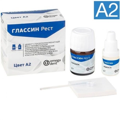 Описание: Глассин Рест (А2) 10г+8мл, ОмегаГлассин Рест - стеклополиалкенатный пломбировочный цемент.