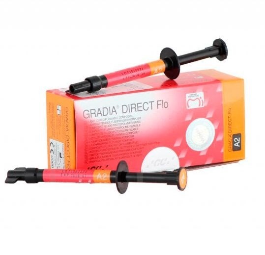 ДЖИ СИ Градия Директ Фло. Светоотверждаемый микрофильный гибридный текучий композит, для реставраций. Отдельные оттенки. Упаковка: 2 шприца (1.5 г материала в шприце), 4 металлические насадки для шприцев Dispensing Tip Needle.