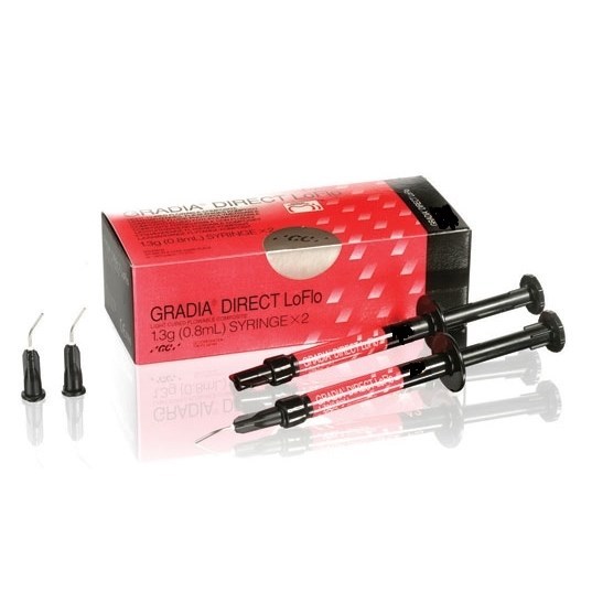 ДЖИ СИ Градия Директ ЛоФло. Материал реставрационный (светоотверждаемый микрофильный гибридный текучий композит, для реставраций). Отдельные оттенки. Комплект: шприц с материалом (2 шт по 1.3 г), насадки для шприца, защитные колпачки.