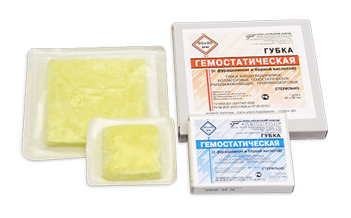 Губка кровоостанавливающая представляет собой пластину желтого цвета со специфическим запахом уксусной кислоты, с пористой структурой, с рельефной поверхностью, хорошо впитывает жидкость, при этом слегка набухают.