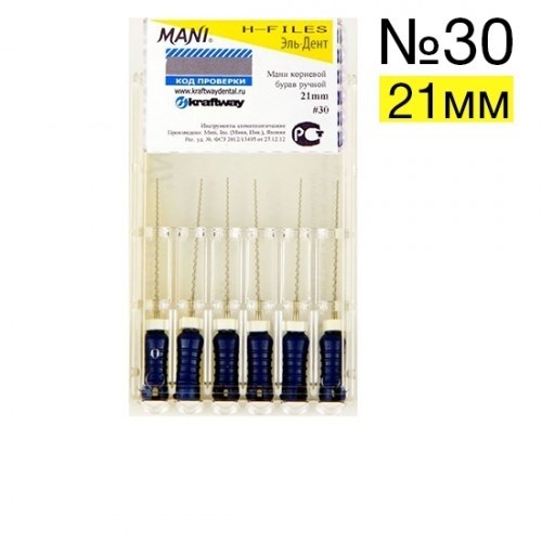 Описание: H-Files №30 (21мм), 6шт MANIМани корневой бурав ручной (Mani H-Files)