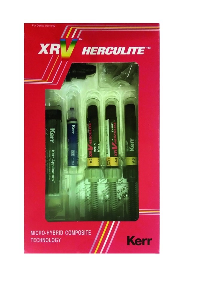 Herculite Mini Kit (3 шприца по 3 г), малый набор: шприцы (по 3 г) эмалевых оттенков А2, C3 , дентинный оттенок D3, бутылочка (3 мл) адгезив OptiBond Solo Plus, протравливающий гель (3 г), 25 емкостей для смешивания, 50 одноразовых аппликаторов. Herculite XRV представляет собой фотополимеризуемый композитный реставрационный материал, содержащий 79% по весу (59% по объему) неорганического наполнителя со средним размером частиц, составляющим 0.6 микрон. Все оттенки материала Herculite XRV, кроме оттенков режущего края, являются рентгеноконтрастными. Восемьдесят четыре процента частиц имеют диаметр менее 1 микрона. Содержание наполнителя составляет 79%. Содержание наполнителя по объему составляет 59%. Срок годности: 3 года (хранить при компнатной температуре).